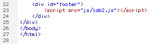 Open the lab2_fixed.html file that you created in the previous Lab2: CSS Layout 1 Column lesson. Go to the code view and between the footer, link to the new external JS file.
