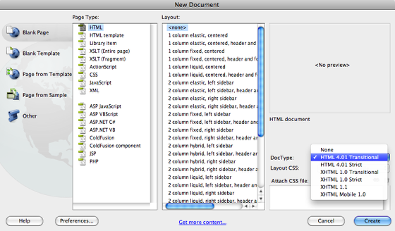 Open a new HTML file in Dreamweaver, since this page is going to have internal JavaScript it is best to set its DOC Type to HTML Transitional (reference the image above).