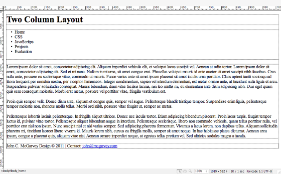 Go to code view and review the structure of the 2 column template file. All of the divs are nested within a container div. There is also a second div with the id nav which will be used to create a left hand column for the main navigation. Inside this div is an unordered list which will be styled as the main navigation buttons later.