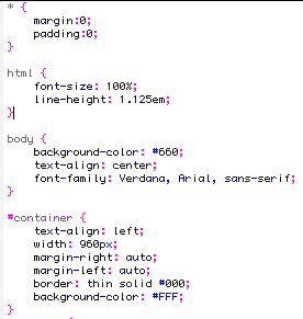 For the container div, I am creating a fixed width layout at 960px with a styled border. I set the left and right margins to the container div to auto so it would be centered in the browser. I gave the container a background color of white and made sure the text was aligned left.