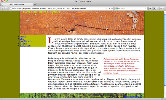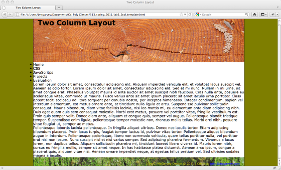 Download the two_column_template.html file and open it in Dreamweaver. Also download a header image (I have given you several to choose from) file and save it into your images folder nested inside your 513 root directory. Name the file lab3_2col.html.