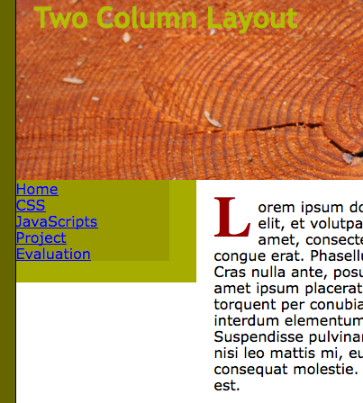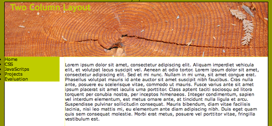 This is the look of the two column layout. The final step to define the style for our vertical navigation bar. Create a third external style sheet named vert_nav.css and save it into your CSS sub folder. Link the file to your template. You have now have three different external style sheets for this page. One defines the layout of your divs, one the special text style, and the third one creates the vertical navigation bar. Your head section should look something like this: