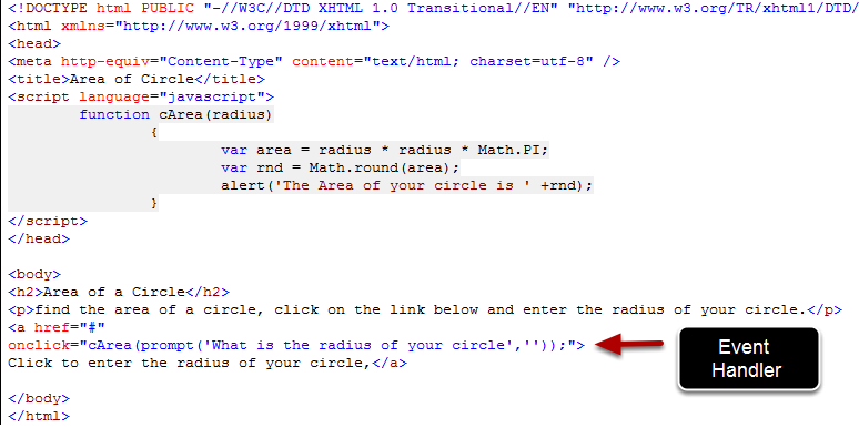 <a href="#" onclick="cArea(prompt('What is the radius of your circle',''));"> Click to enter the radius of your circle,</a>