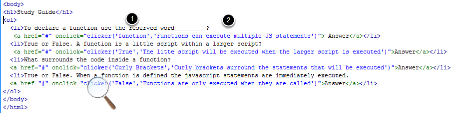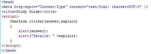The clicker function has two parameters that are passed through the funciton. One is named answer and the other explain. You can think of parameters as variables that pass values into the JavaScript statements within the function. In this example, each parameter will be printed in a popup alert.