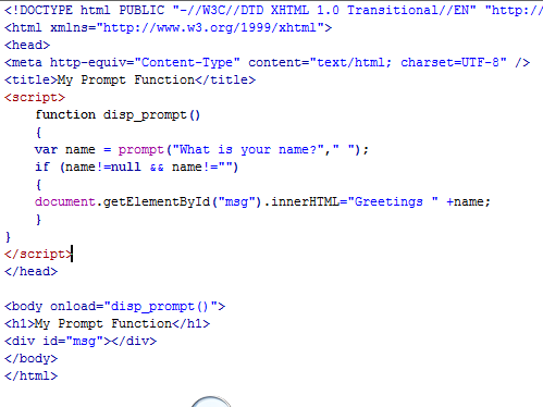 4. The final statement uses the getElementById method to select the msg div and place within it the greetings using the .innerHTML.