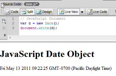 In the external javascript file, we are going to declare a variable called d and assign it a new date object. This will then be printed using a document.write statement. The result is not pretty as it contains more information then you might want.