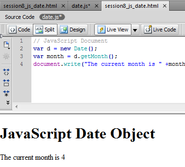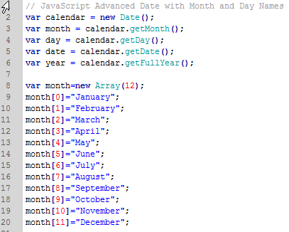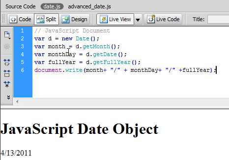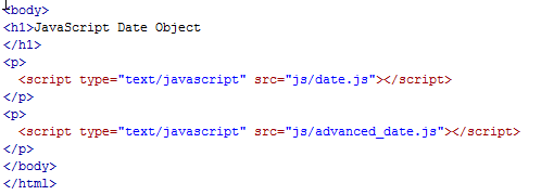 For our advanced date script we are going to create a second external js file and attach it to the same date.html web page. Save the file as advanced_date.js in the js folder. Then attach the external javascript to the date.html after the previous date script. I placed each external script in it's own paragraph.