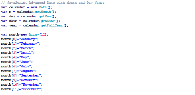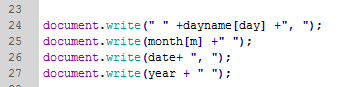 In the first document.write statement the uses an array to print the day name of the week, a blank space is added to make sure there will always be a space between the date and any content on your page before the script. The second document.write uses an array to print the month name. The third document.write statement prints the day of the month while the final statement prints the full four digit year.