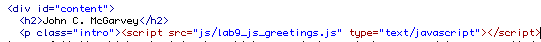 Create a new external js file and name it lab9_js_greeting.js. Open the index.html page in your portfolio. Within the first intro paragraph inside the div with the id content, create scripts tags that link to this external javascript.