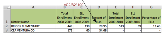 - Use the formula =C2/B2*100 to generate percentage of ELLs for each year.