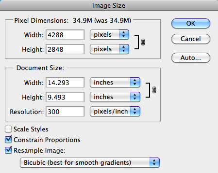 - If you are going to prepare an image to be printed, you need to make sure the image is set to a high resolution. I usually set the resolution somewhere between 200 and 300 pixels per inch.
