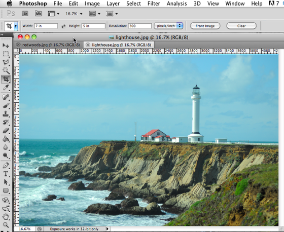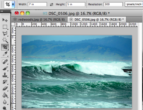 - In the options bar at the top of the screen, I am going to set the width to 7in, the height to 5 in and the resolution to 300 (As you can see, you can set the resolution using the crop tool and you don't even have to use the Resize Command in the Image menu).