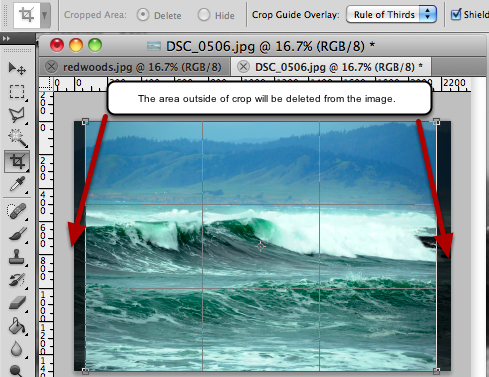 Screenshot of the crop tool, notice the area outside of the crop will be deleted from the image.