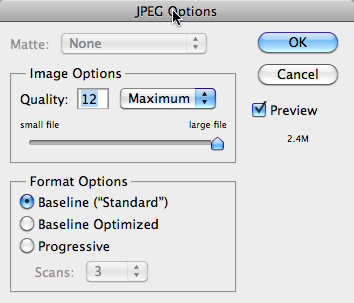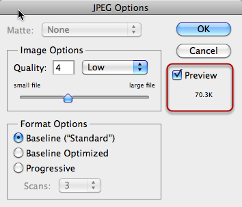 - Using the JPEG Options menu you want to experiment until you get a nice balance of small file size and acceptable quality.