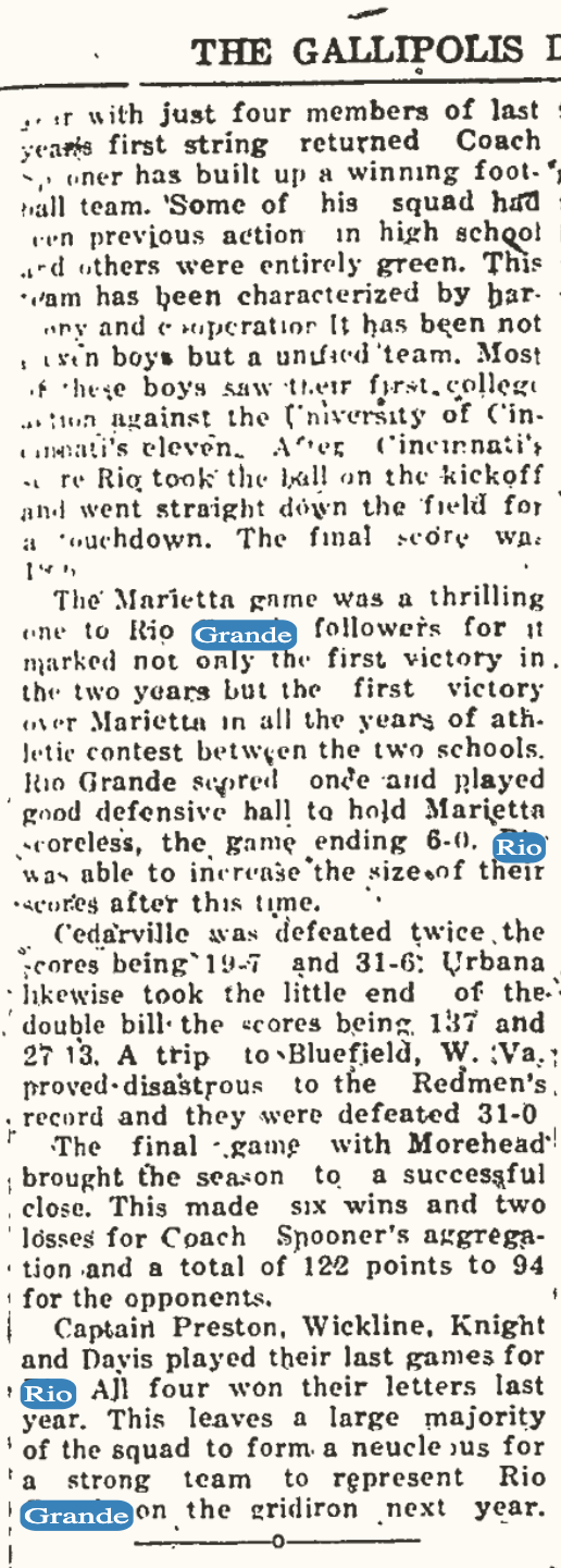 The Gallipolis Daily Tribune, September 10, 1931, page 3. Early preseason report on Rio Grande football practice and schedule.