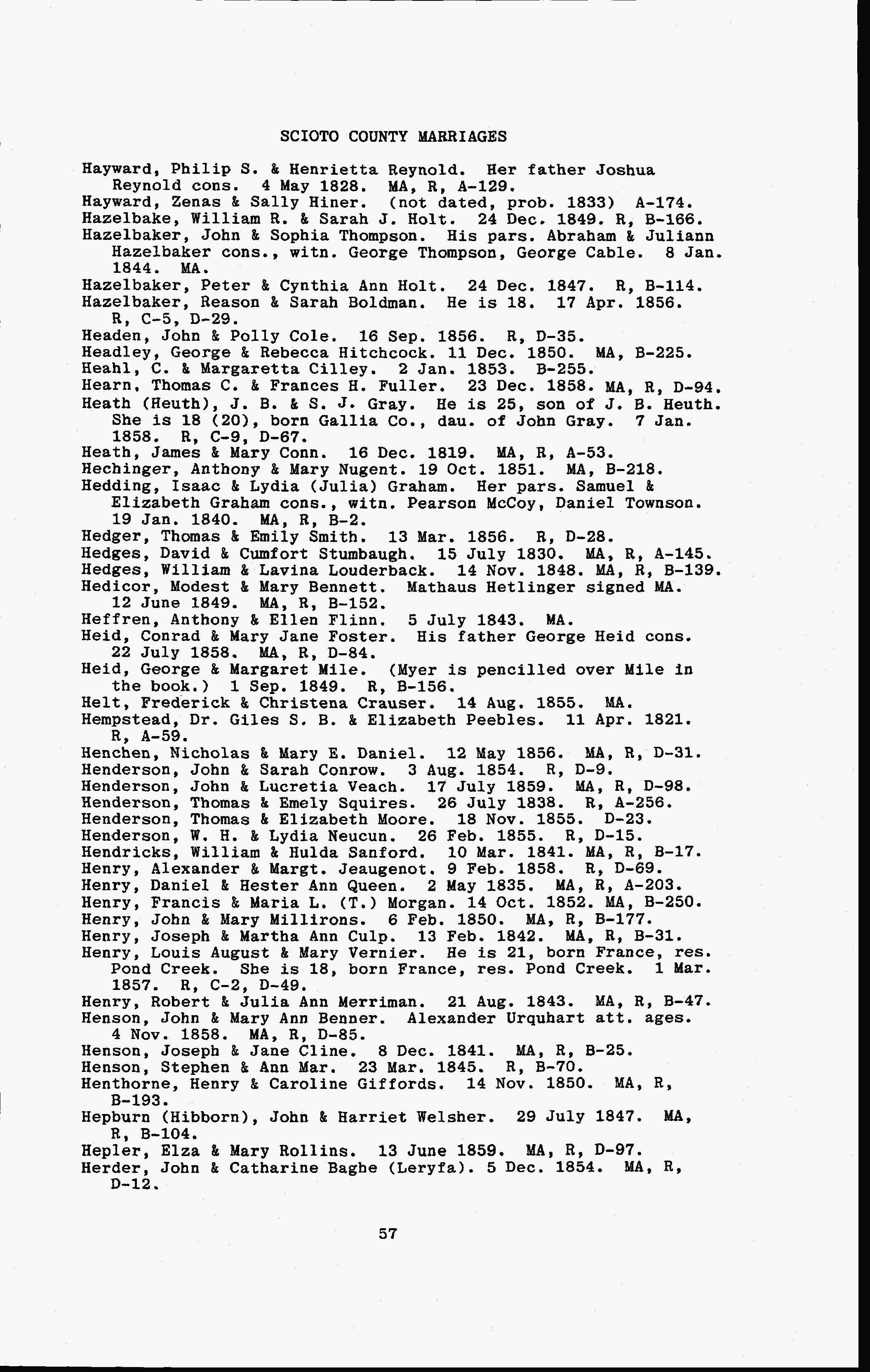 4. Shoemaker, Caryn R. F., and Betty J. Sisler Rudity, comps. Marriage Records of Scioto County, Ohio, 1803–1860. 1987. Reprint, Baltimore, MD: Genealogical Publishing Co., 2003. Database: Ancestry.com, “Scioto County, Ohio, U.S., Marriage Records, 1803–1860,” accessed 2026. Entry for Isaac Hedding and Lydia (Julia) Graham, January 19, 1840. (Derivative compiled source)