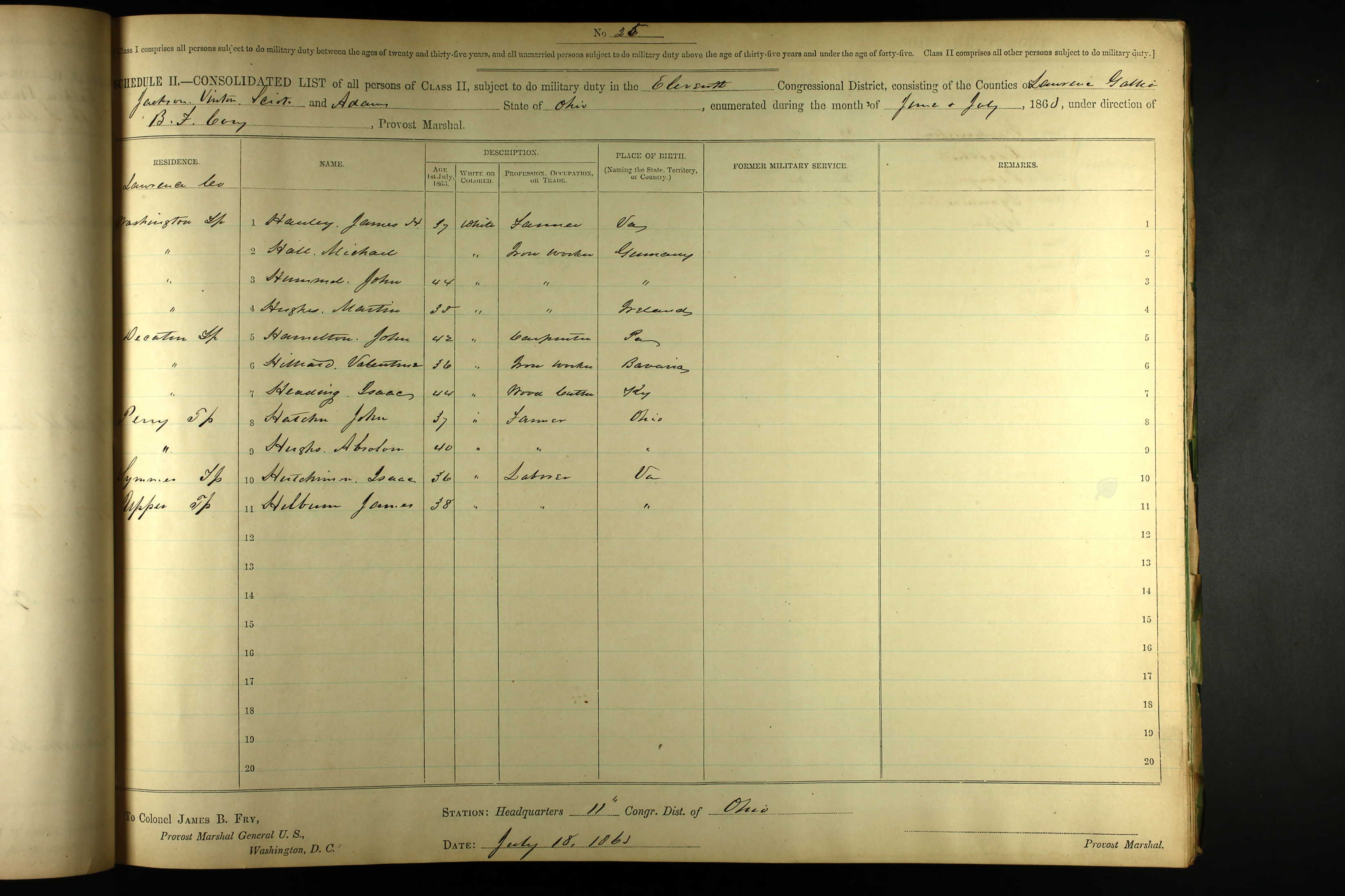 1. Ancestry.com. U.S., Civil War Draft Registrations Records, 1863–1865 [database on-line]. Lehi, UT: Ancestry.com Operations, Inc., 2010. Original data: Consolidated Lists of Civil War Draft Registrations, 1863–1865. NM-65, entry 172, 620 volumes. NAID 4213514. Records of the Provost Marshal General’s Bureau (Civil War), Record Group 110. The National Archives in Washington, D.C. Entry for Isaac Heading, Decatur Township, Lawrence County, Ohio, July 1, 1863. (Primary, draft registration record)