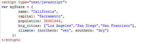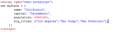 This creates a property for "myState." The name of the property is "stateName." It has a value of "California." Create a property by separating a name and value with a colon. Surround non-numeric values, such as California, with quotation marks, defining it as a text string.