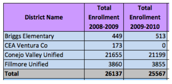 Carry out a new data query so that you obtain total enrollment in Ventura County schools for years 2008-2009 and 2009-2010 (or any two years of your choice). The process is almost identical to the one above in Part 1 except for one thing: Choose Enrollment (not English Learners) before proceeding with the rest of the steps.