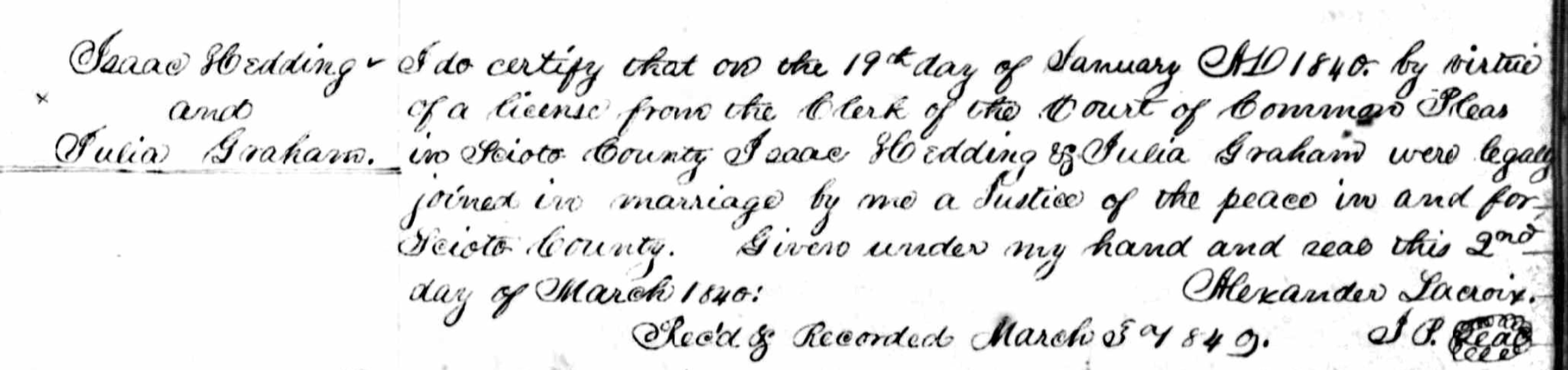 4. Shoemaker, Caryn R. F., and Betty J. Sisler Rudity, comps. Marriage Records of Scioto County, Ohio, 1803–1860. 1987. Reprint, Baltimore, MD: Genealogical Publishing Co., 2003. Database: Ancestry.com, “Scioto County, Ohio, U.S., Marriage Records, 1803–1860,” accessed 2026. Entry for Isaac Hedding and Lydia (Julia) Graham, January 19, 1840. (Derivative compiled source)