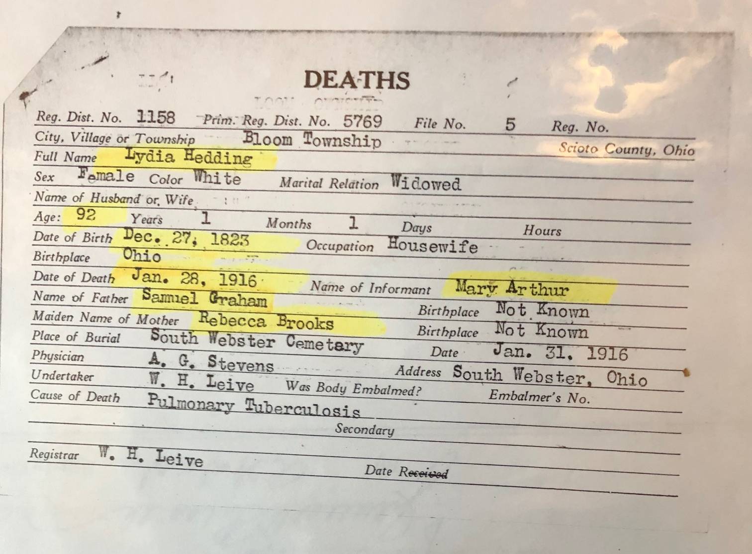 5. Ohio Death Certificate, Lydia Hedding, Bloom Township, Scioto County, Ohio, January 28, 1916. Recording father as Samuel Graham and mother as Rebecca Brooks. (Primary)